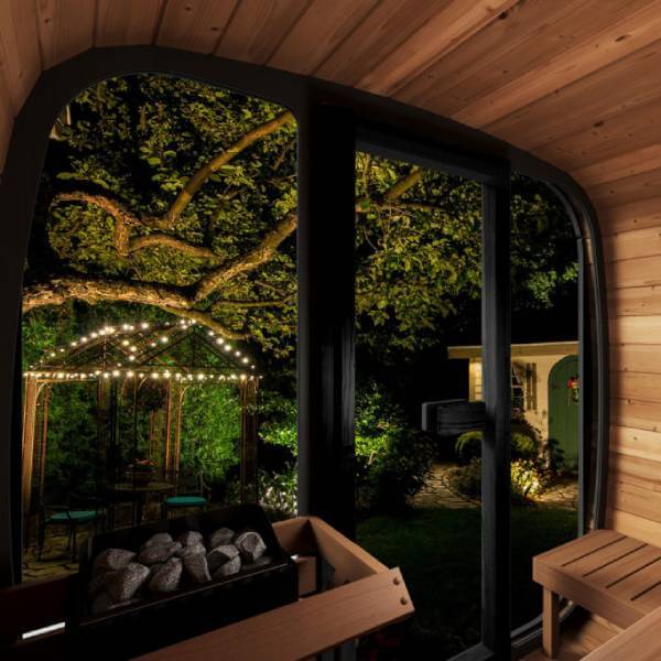Experience ultimate relaxation with contoured seating and supportive arched backrests, designed for long, comfortable sauna sessions. Satin-smooth thermo-aspen seating stays cool to the touch, while the expansive glass front wall adds an airy, bright atmosphere and stunning outdoor views.